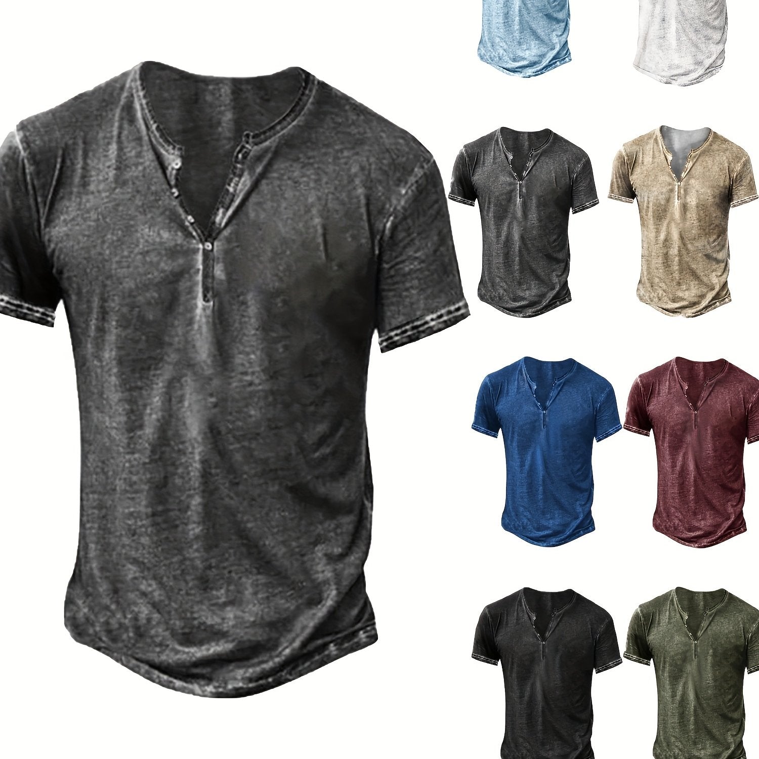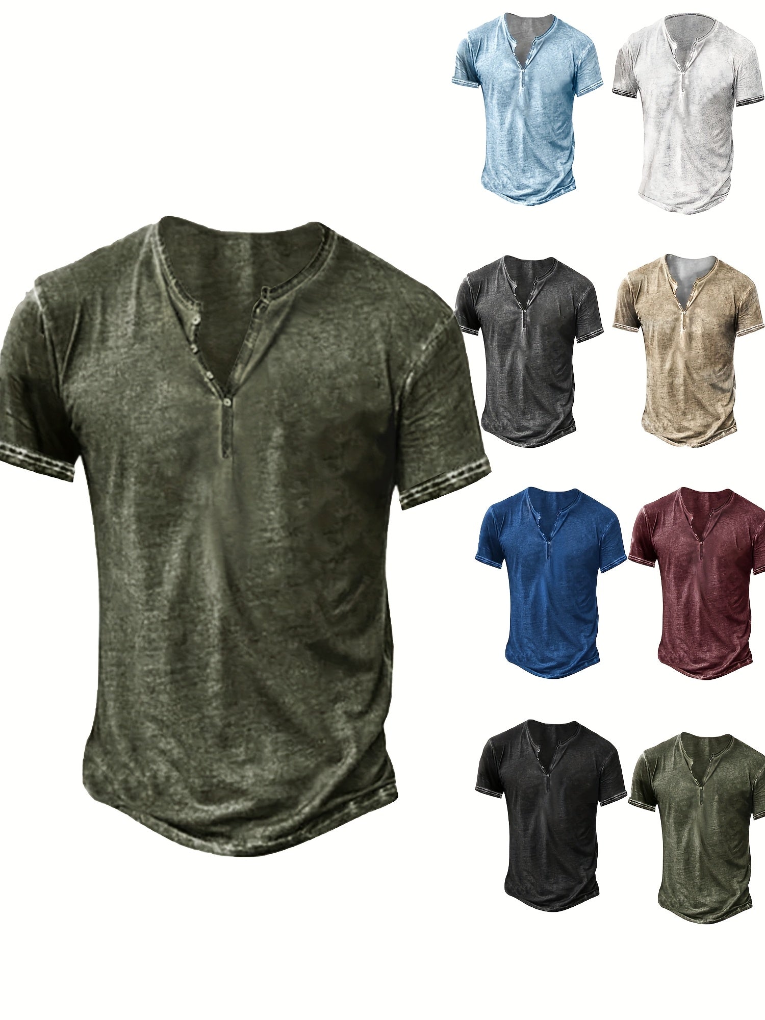 Mens Distressed Henley Shirt Short Sleeve Cotton Slim Fit